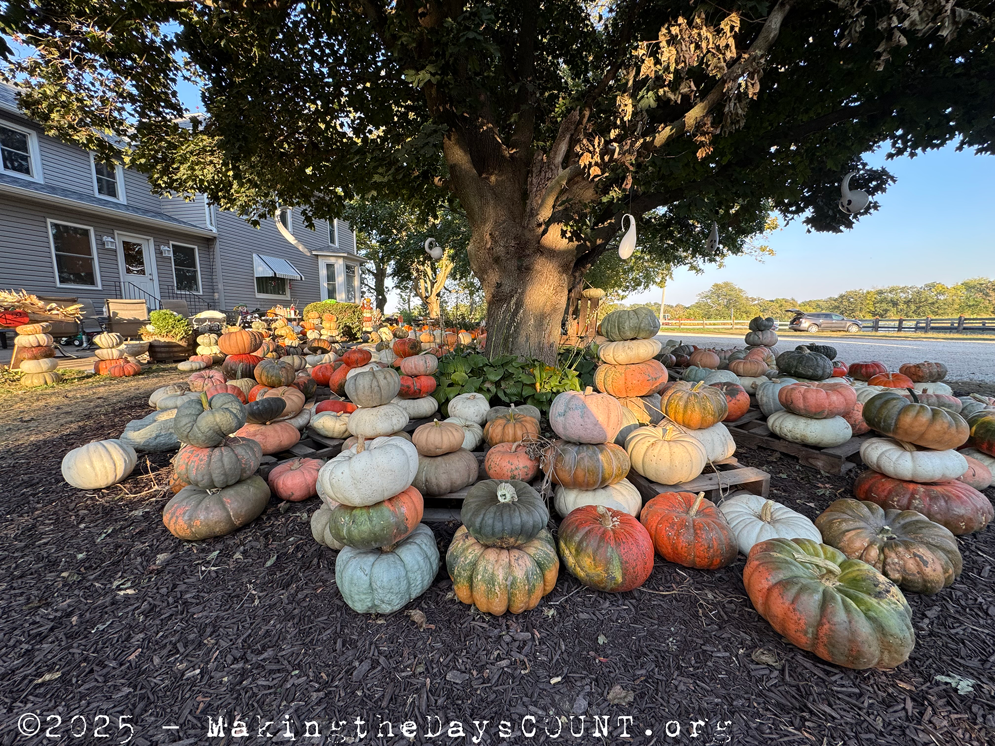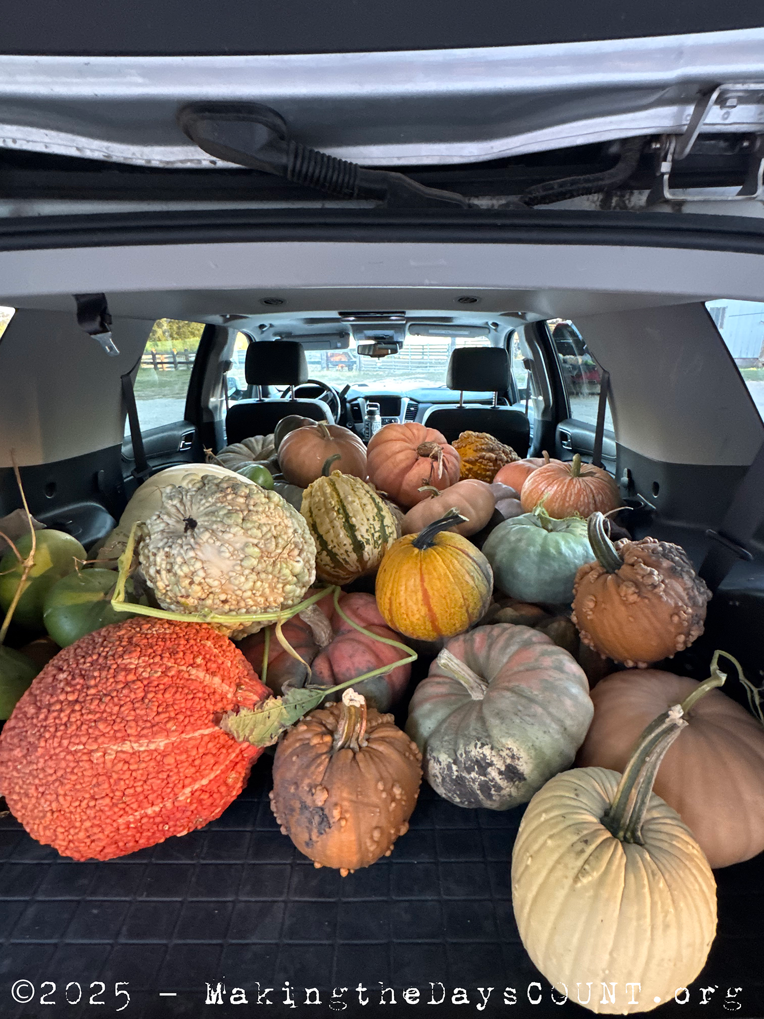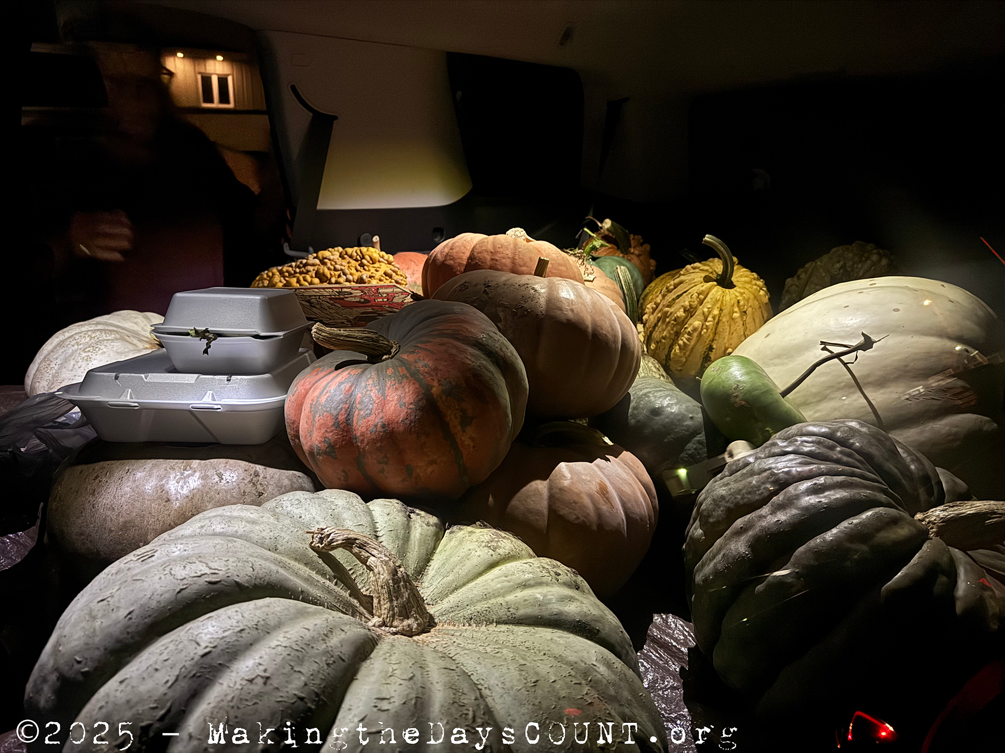 We always arrive late in the afternoon and have picked our pumpkins, visited, explored, and loaded before the sun sets over the fields. We always stop for dinner at a local restaurant on our way home. It’s our tradition and it feels right. When dinner is finished, it is dark, and we drive home. It’s been a full day when we pull into the driveway and unloading the car will have to wait until the morning.