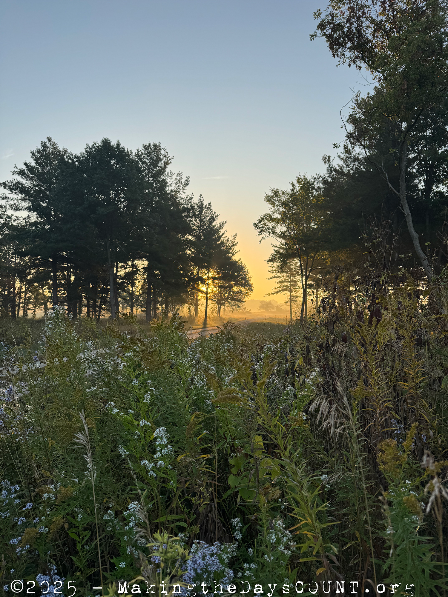Last week, I took the road less traveled and passed by the forest preserve in full sunrise. It was a humid morning with ground fog which scattered the sun’s light. It was beautiful.