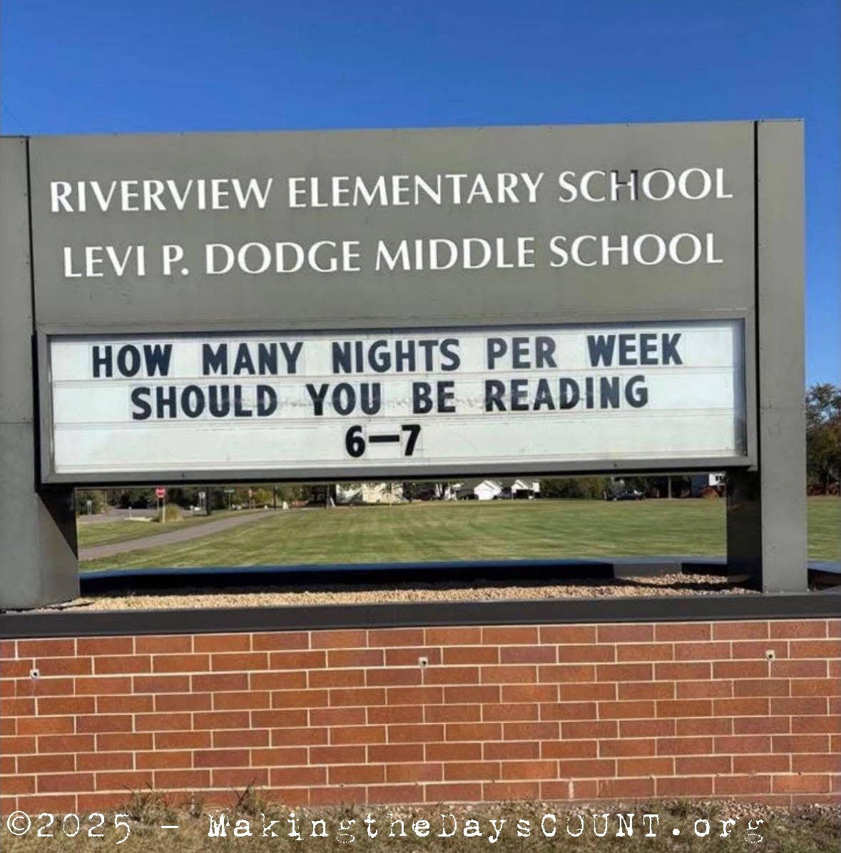 Last week, a friend forwarded me a photograph of a sign in front of middle school in Minnesota poking fun at the 6-7 phrase\craze used by our students. The photo is at the bottom of the post. On Friday of last week, I shared it with our principal who, shared it with the PTSA, who are in charge of the sign; and ‘presto chango,’ a BLANK SIGN becomes a message to the world or two messages. Ha!